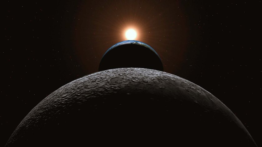 The screen is dark. Eerie and oddly dissonant music begins to play. The screen remains black. At two-minutes and fifty seconds the music stops, followed by six seconds of silence over the blank nothingness before the Metro-Goldwyn-Mayer MGM logo fills the screen as the symphonically ascending chords and drumbeats of Richard Strauss’ Also Sprach Zarathustra increase in volume. In a view from the moon, the sun rises behind and then above the blue sphere of the earth.