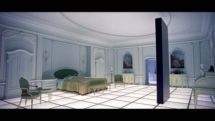 In Kubrick’s 2001, the monolith appears four times: At the “dawn” of prehistoric man, on the Moon, in outer-space orbiting Jupiter, and at the bedside of the dying Bowman before the revelation of the star-child. With the appearance of the first monolith, ancient man envisions a bone as a weapon to be used for hunting and war. Upon the excavation of the second monolith on the moon, mankind is directed towards deeper space where the black monolith orbiting Jupiter transports Man to another dimension of being. The final appearance of the monolith is seen at the foot of the dying Bowman’s bed, before the birth of the star-child; which appears to represent mankind’s symbolic transformation.