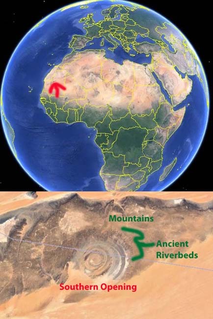 The narrator of the above YouTube video also pointed out how the entire area looked like it was formed by an ancient tsunami complete with striations going west to east from the Atlantic Ocean. These patterns also correspond to the erosion seen on the outer rings of the Richat Structure.