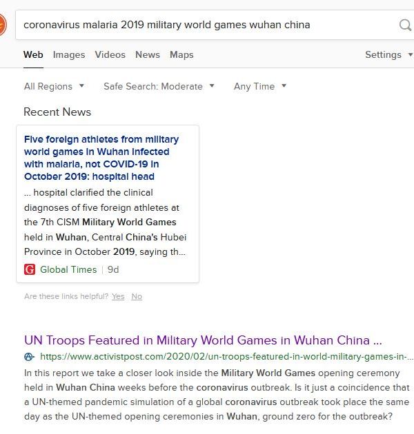 Accordingly, the Global Times posted an article entitled “Five foreign athletes from military world games in Wuhan infected with malaria, not COVID-19 in October, 2019: hospital head”, that has since been scrubbed from the internet.  However, here is a screenshot showing the search result as proof the article once existed: