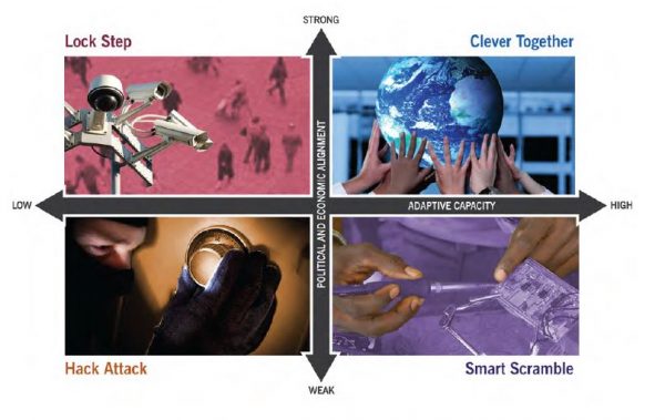 In 2010, the Rockefeller Foundation and the Global Business Network drafted a document entitled “Scenarios for the Future of Technology and International Development” which outlined the following potential plans schemes through 2030: “Lock Step”, “Clever Together”, “Hack Attack”, and “Smart Scramble”.