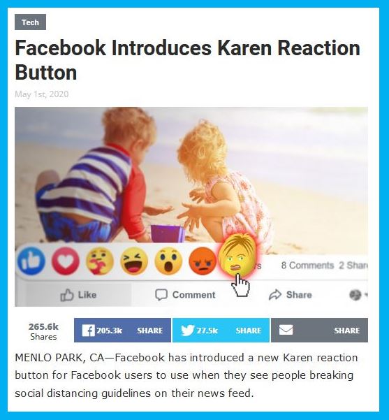So I’ve since learned the label of “Karen” began as a means to advance identity politics and was later reassigned to sarcastically disparage the New American Stasi for squealing on their neighbor’s COVID-19 Social Distancing® infractions. A few examples include “The Babylon Bee” satire website reapportioning “KAREN” into Knowledgeable Actors Reporting Edict Noncompliance and jokingly imagining a Facebook button that would allow Karen’s to brand on social media any postings of potentially Coronavirus-infected children playing too close together outdoors.