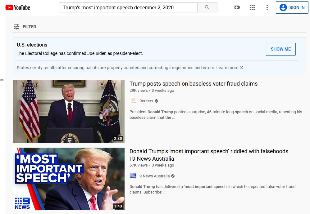 Furthermore, if you go to YouTube and query “Trump’s most important speech december 2, 2020” this is what appears: “Fact-check” videos on Trump’s “baseless voter fraud claims” and “speech riddled with falsehoods”.