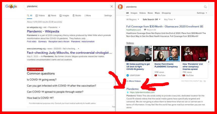 Now try this: Search for the word “Plandemic” on the Duck Duck Go search engine, and you will see the website for PlandemicVideo.com appearing at the top of the results. But if you search the same term on Google, the Plandemic video website does NOT show. Instead, you will see a Wikipedia link labeling Plandemic as “misinformation” and a science magazine’s website “fact-checking” “unsubstantiated claims and accusations”.